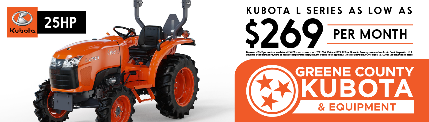 Payments of $269 per month on new L2502DT based on sales price of $19,279 at $0 down, 3.99% A.P.R. for 84 months. Financing available from Kubota Credit Corporation, U.S.A.; subject to credit approval. Payments do not include implements, freight, delivery, or taxes where applicable. Some exceptions apply. Offer expires 12/31/2025. See dealership for details.